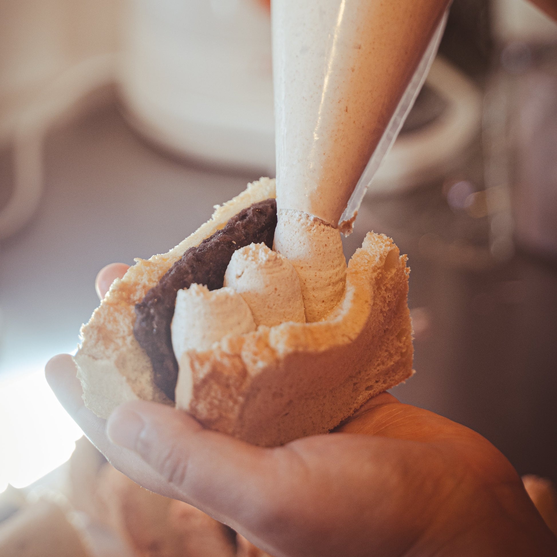 きなこを180℃の超高熱水蒸気で熱を入れます。この工程を入れる事できなこ本来の香りが立ち上がります。それを独自の配合で作ったクリームと手作業でかき混ぜます。生クリームよりもふわふわした口当たりの、特製きなこクリームが出来上がります。それに粒あんを合わせる事で食感や風味の、最高の相性の良さを楽しめます。